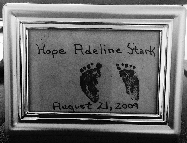 That feeling is cemented, once again, as I sit in my home office, trying to work. To my left is a small silver frame. Safely ensconced inside is a little placard with our baby’s tiny footprints. Neither her left nor her right foot is as big as the tip of my thumb, but they are real and they are perfect. Ten tiny toes, two perfect little feet, which I suspect might have been pigeon toed, like me. Above her prints someone – a nurse, the chaplain maybe, I’m not sure – lovingly penned her name, Hope Adeline Stark, and her date of birth beneath them. It is my tangible proof that she was real, that we have a daughter, even if she wasn’t with us for very long. Of all that God has blessed me with, the contents of that frame mean so much.